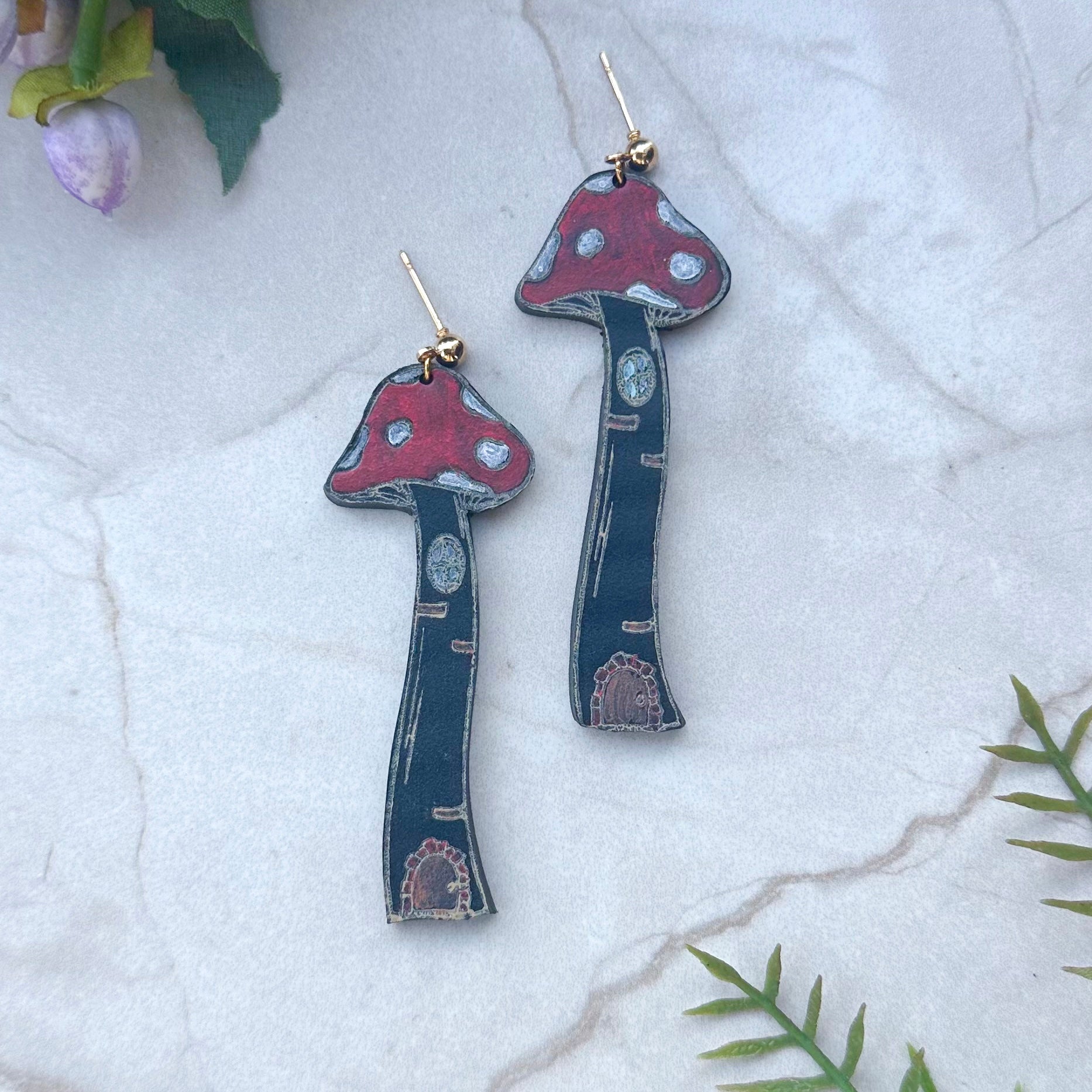 Get whimsical with our Mushroom Towers in Black! Hand stamped and painted using the dry brush method and featuring a charming cottagecore style, these towers will add a touch of fantasy to any look. Perfect for the quirky and playful at heart.